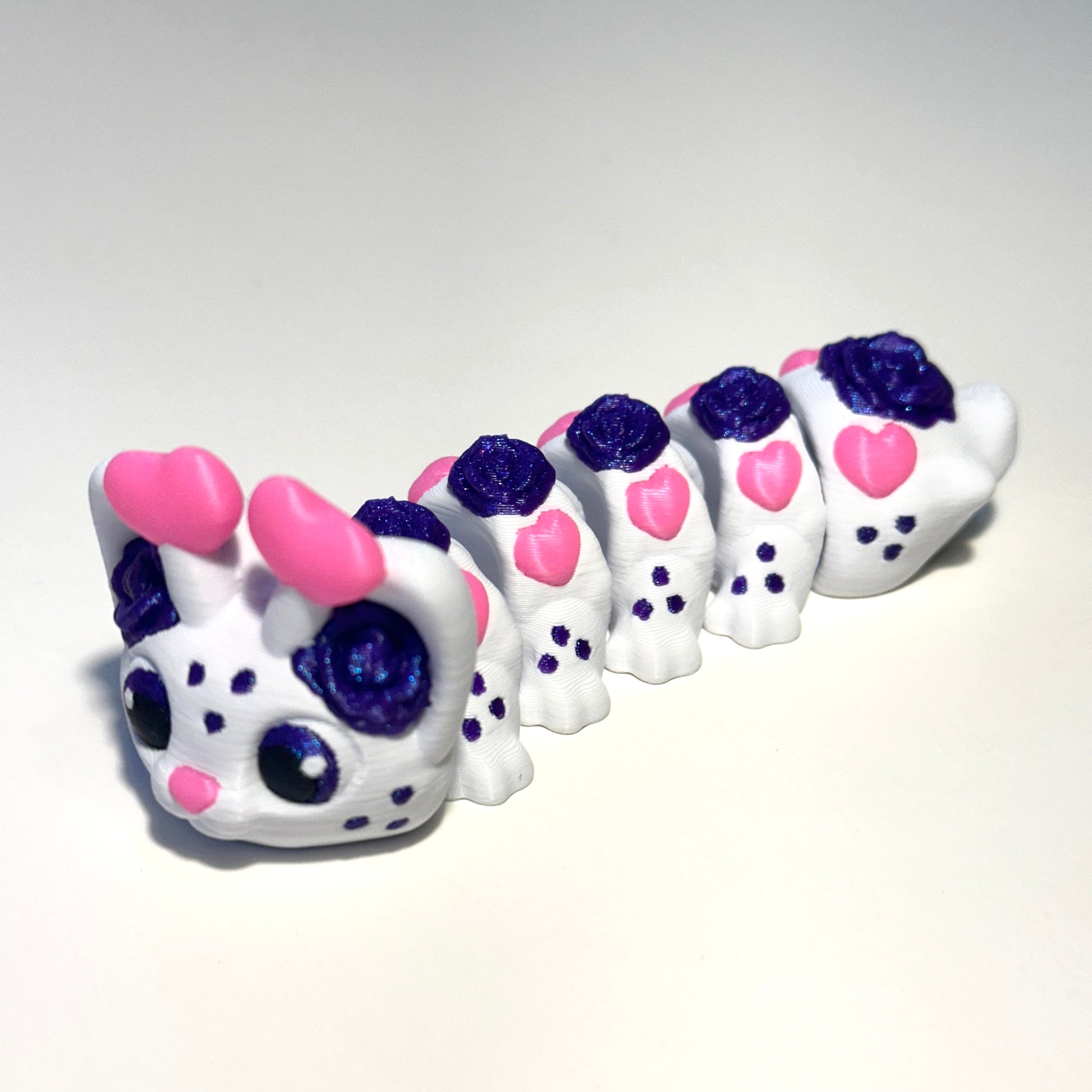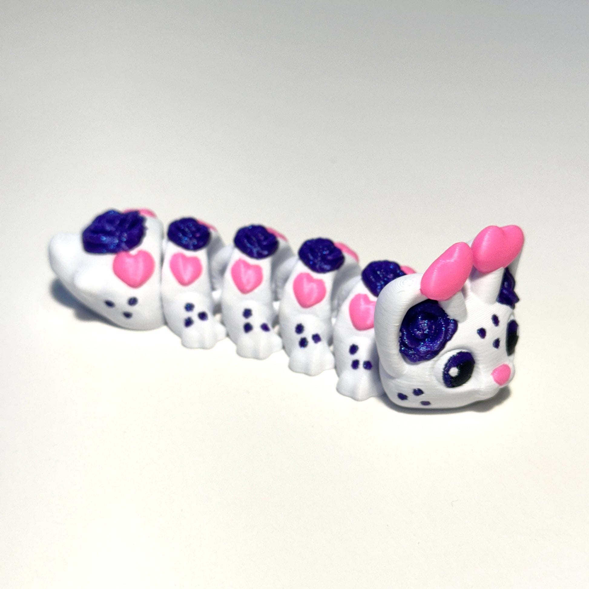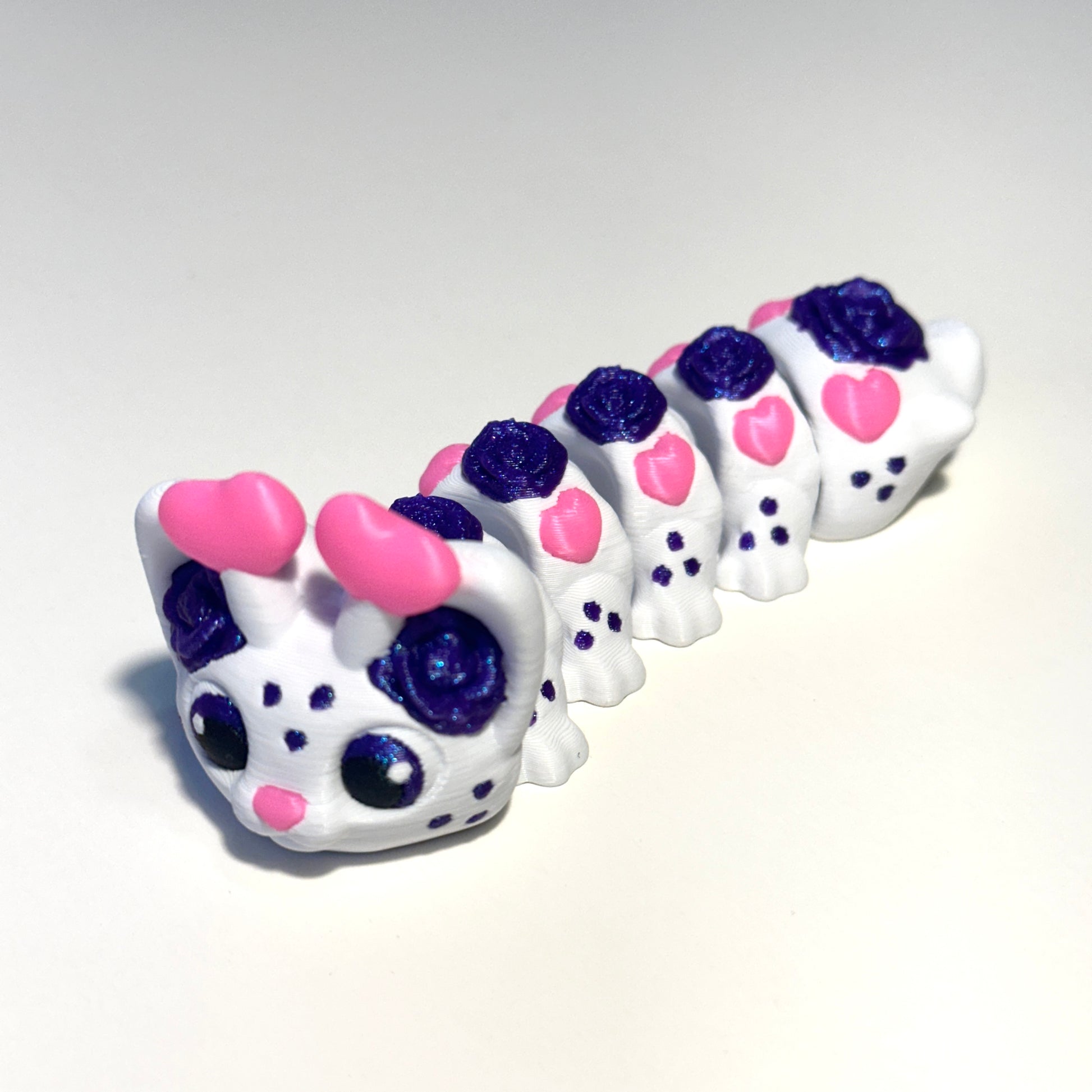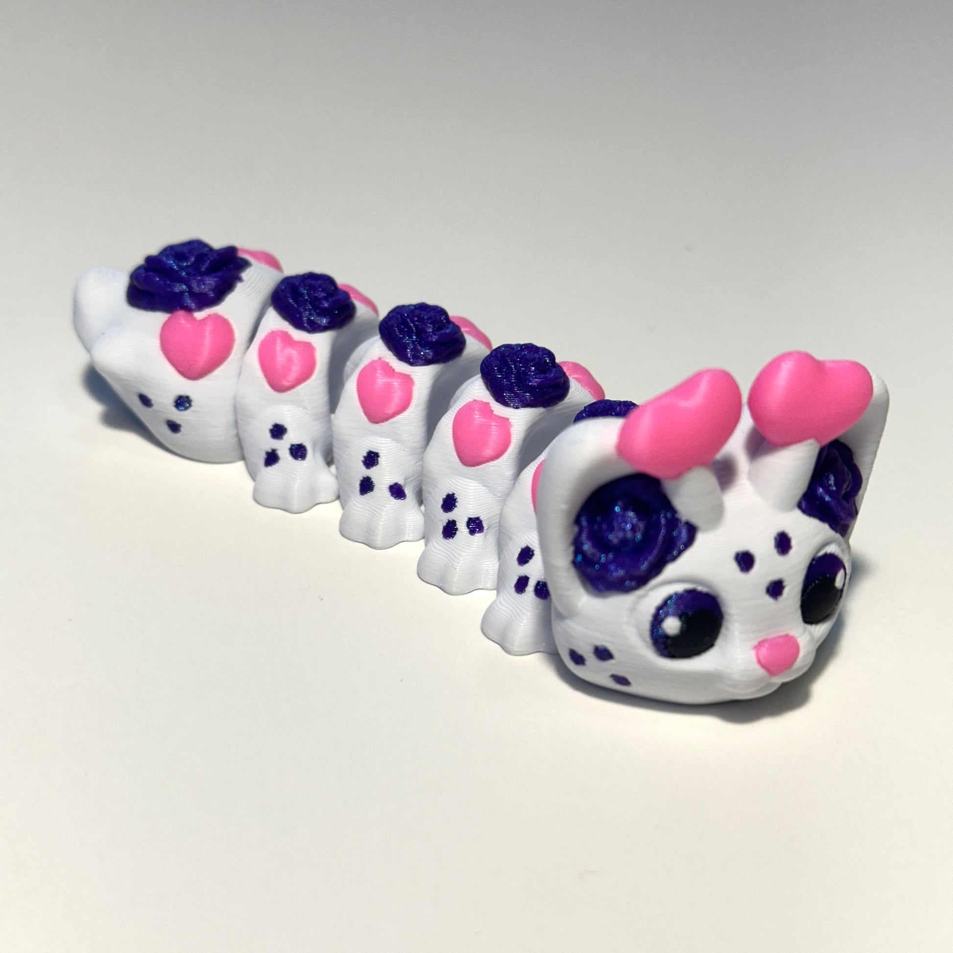 Bring a touch of whimsy to your collection with this charming 3D printed Cat-er-pillar, a unique blend of feline grace and caterpillar fun! Measuring approximately 4.5 inches long, this fully articulating design features a playful, multi-color print that makes it a delightful conversation starter or desk companion.