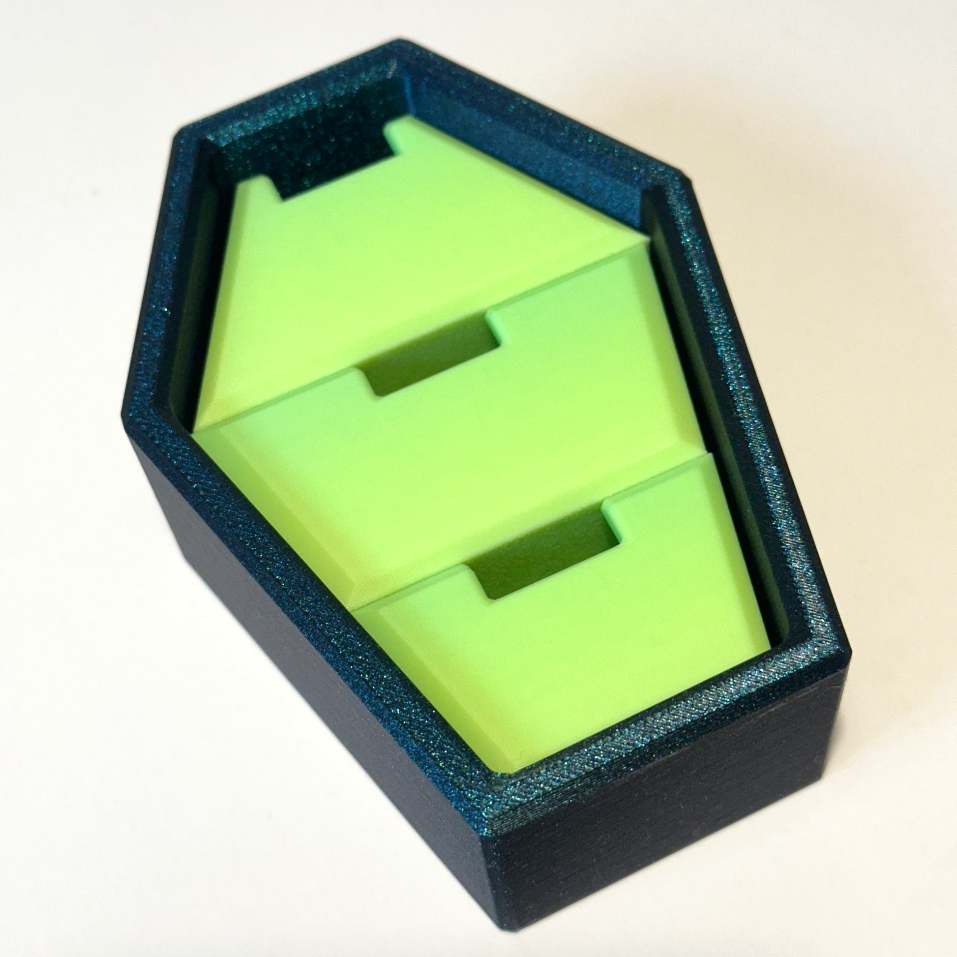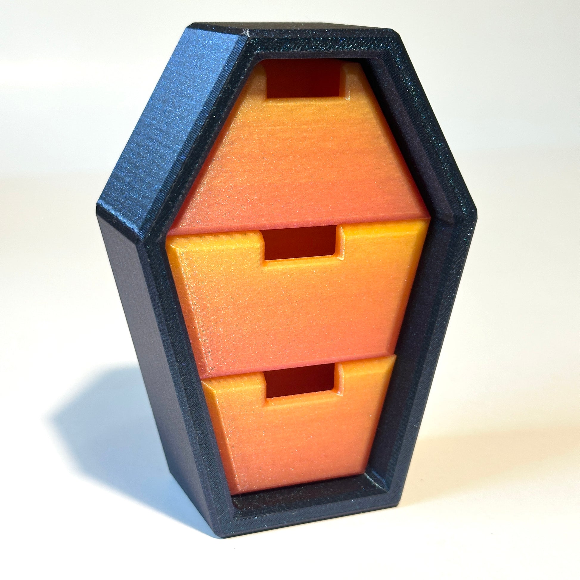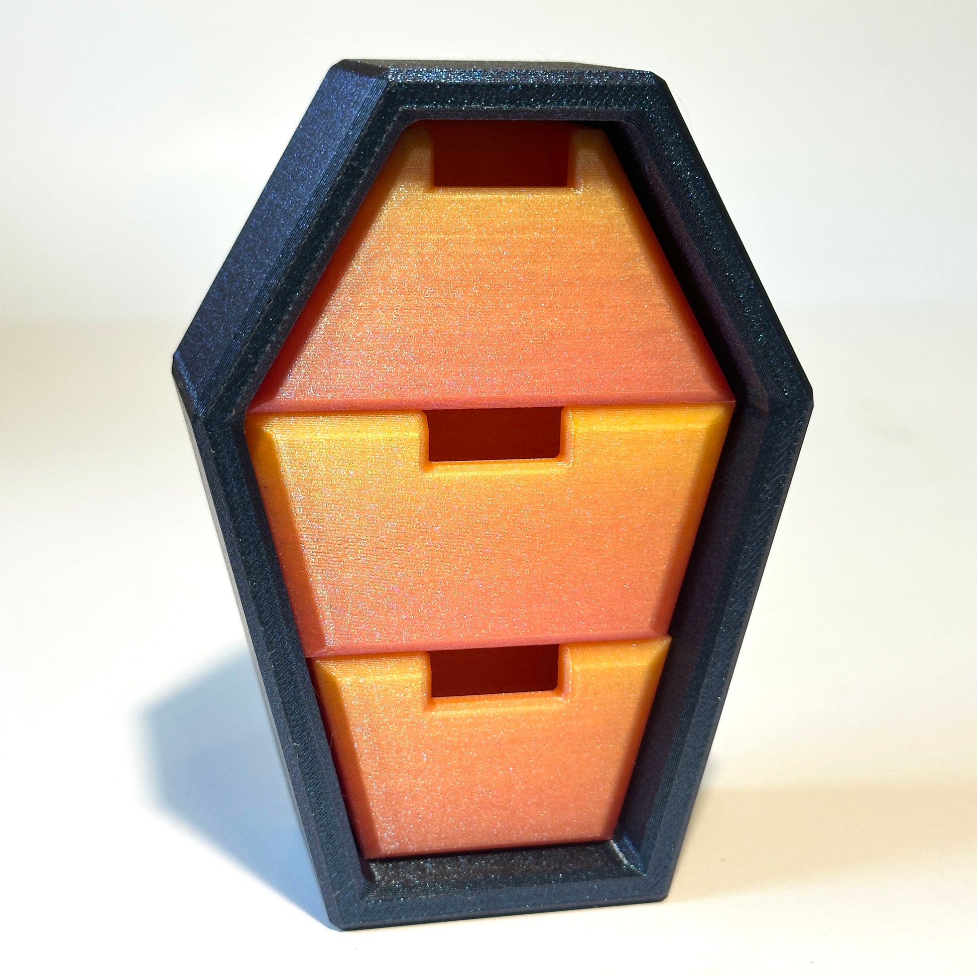 Add a spooky touch to your space with this 3D printed Coffin Storage Box, featuring three functional drawers hidden inside. Measuring approximately 4.5 inches long, this unique piece is both decorative and practical—perfect for storing jewelry, trinkets, dice, or other small treasures.