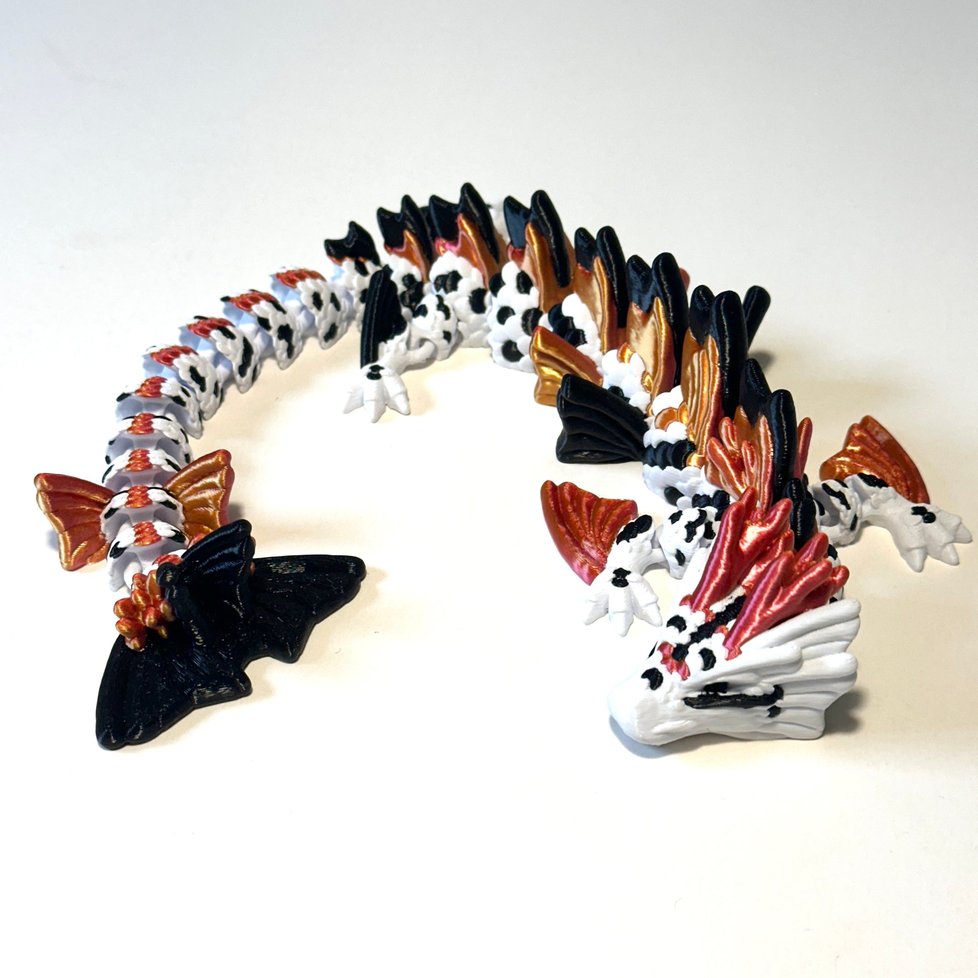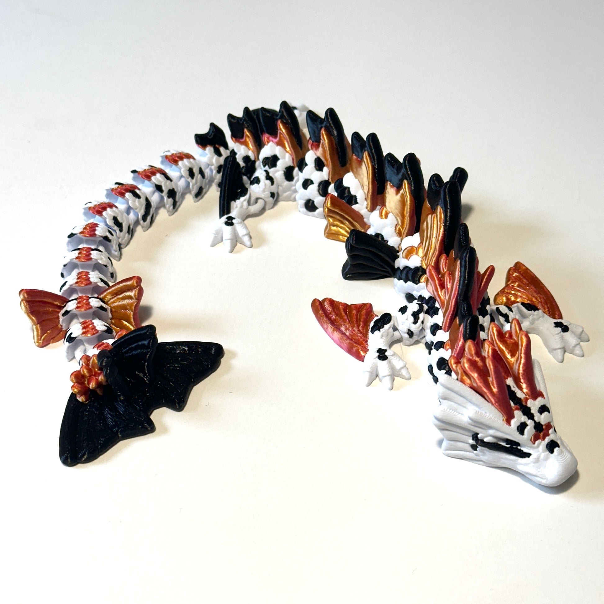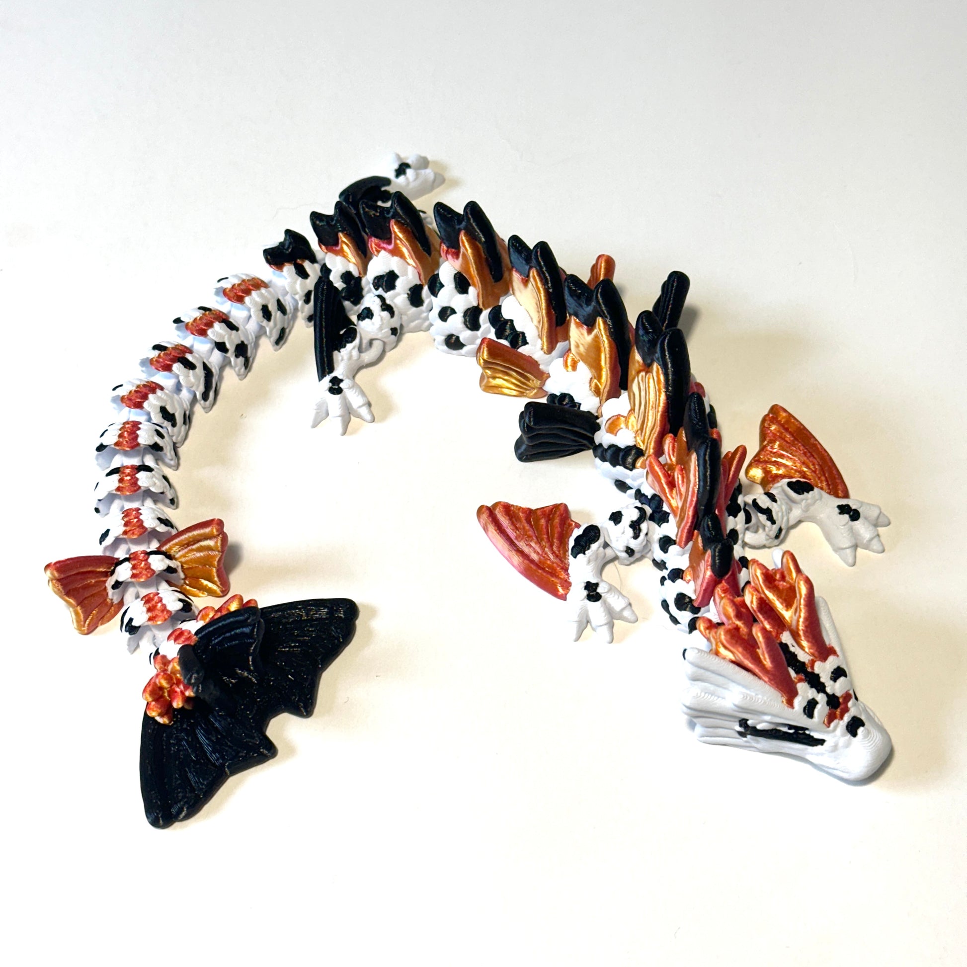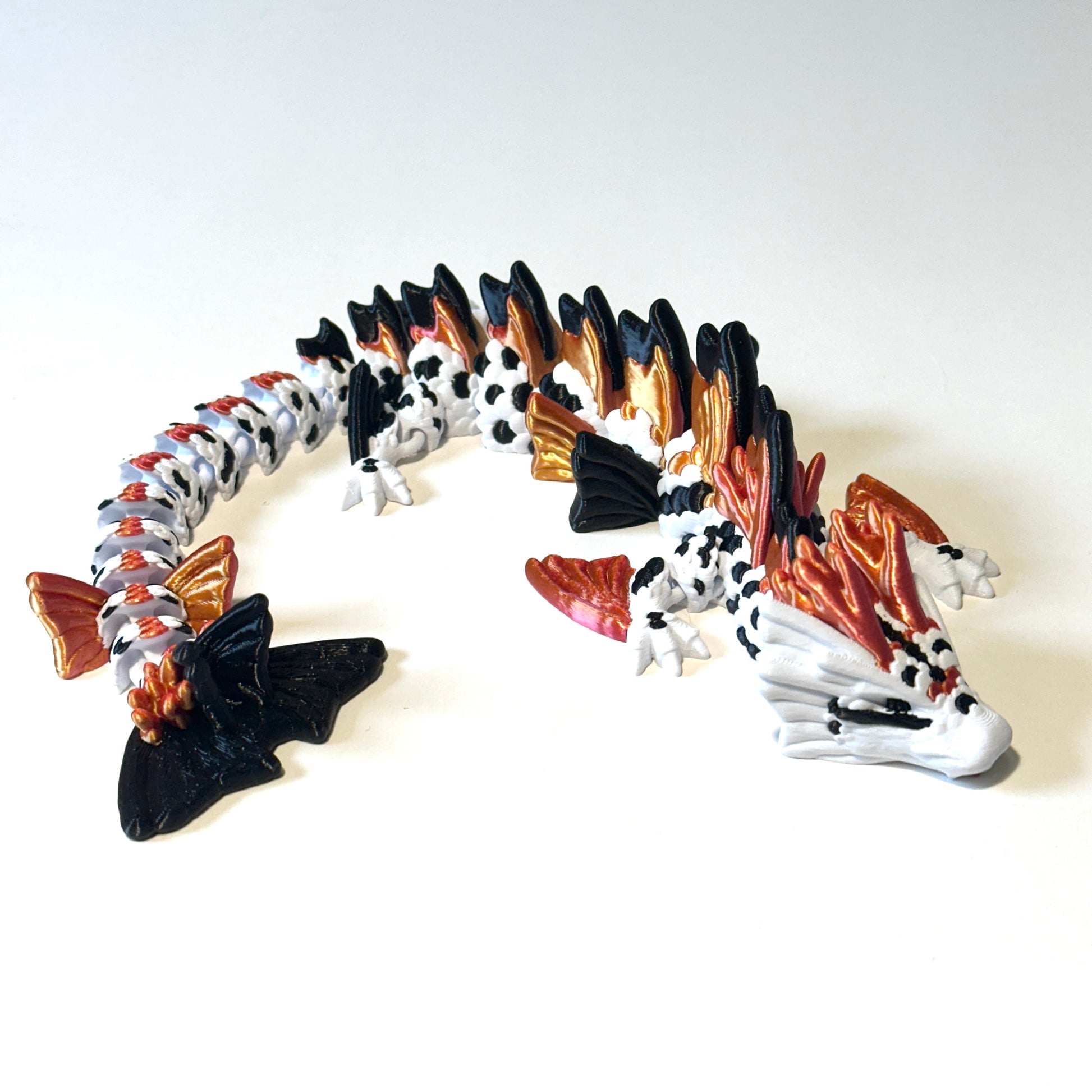 Bring a splash of elegance and motion to your collection with this stunning 3D Printed koi Dragon! Inspired by the graceful flow of koi fish and the majestic form of dragons, this fully articulating model is approximately 14 inches long and printed in a beautiful three-color blend that gives it a vibrant, eye-catching look.