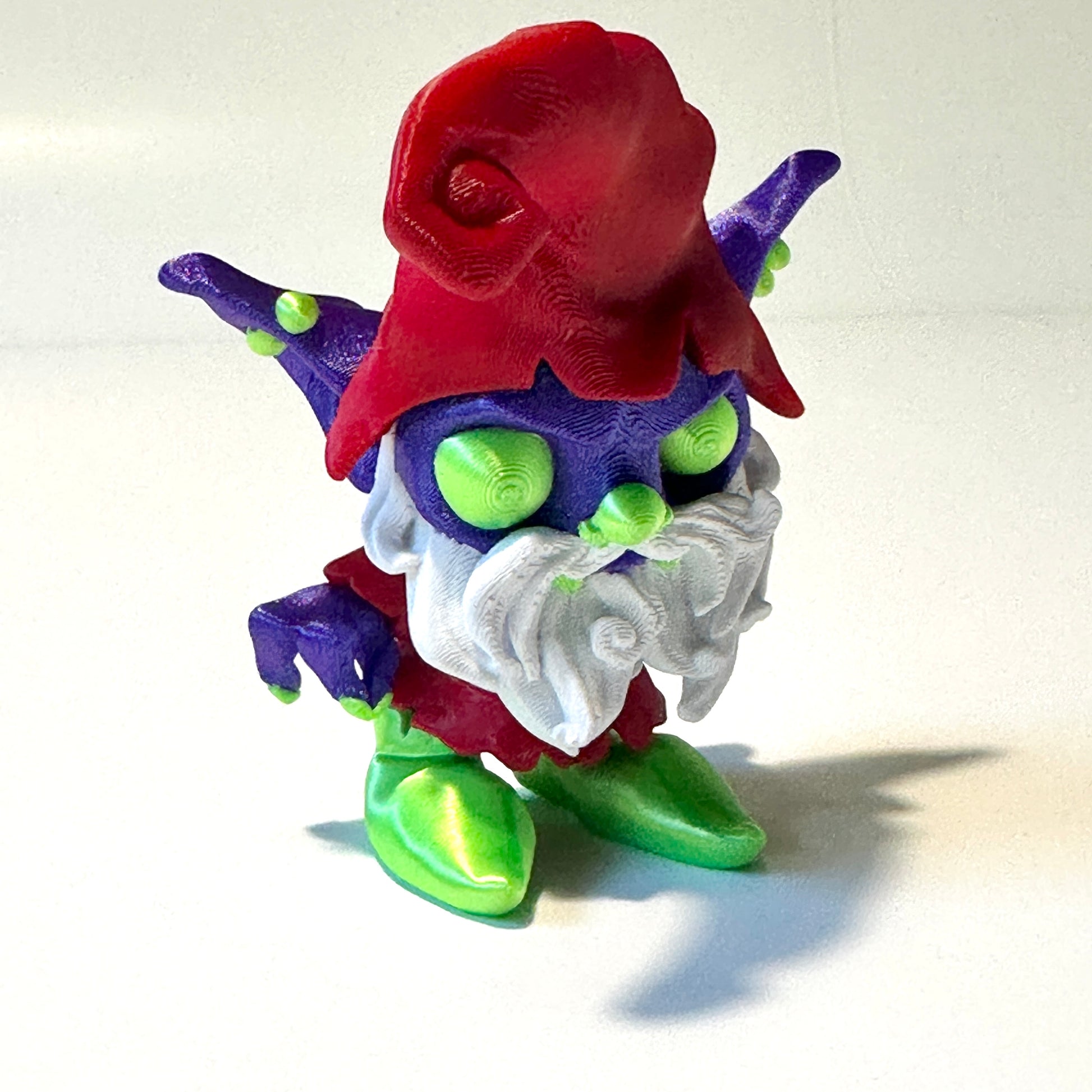 Bring a touch of eerie charm to your space with this fully articulating 3D printed Creepy Gnome! Standing at approximately 4 inches tall, this little gnome is ready to strike a pose—whether it's sitting on a shelf, haunting a garden corner, or adding a spooky flair to your collection.