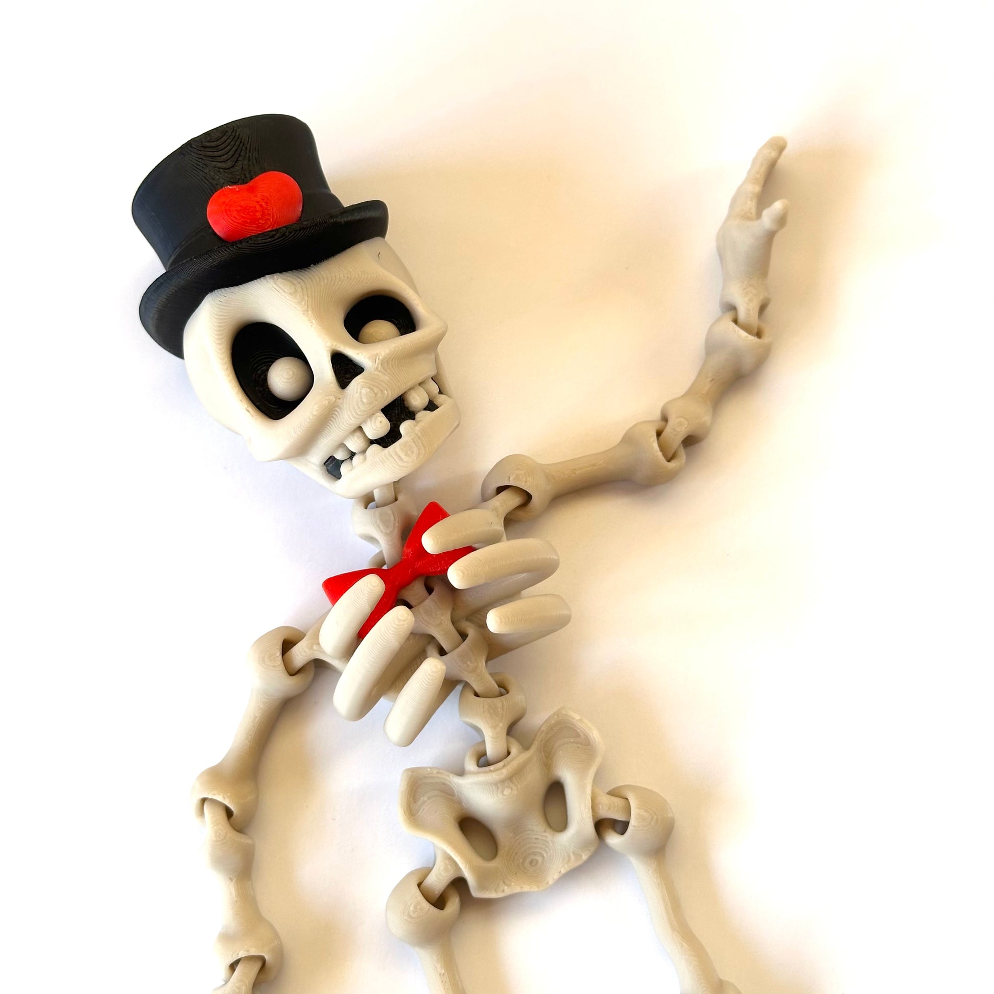 Introducing our 3D Printed Flexi Bone Daddy - the charming skeleton figurine that's as flexible as it is stylish! Crafted with meticulous detail, this delightful creation features a dapper skeleton adorned with a top hat boasting a heart motif and a snazzy bowtie, adding a touch of whimsy to any space.