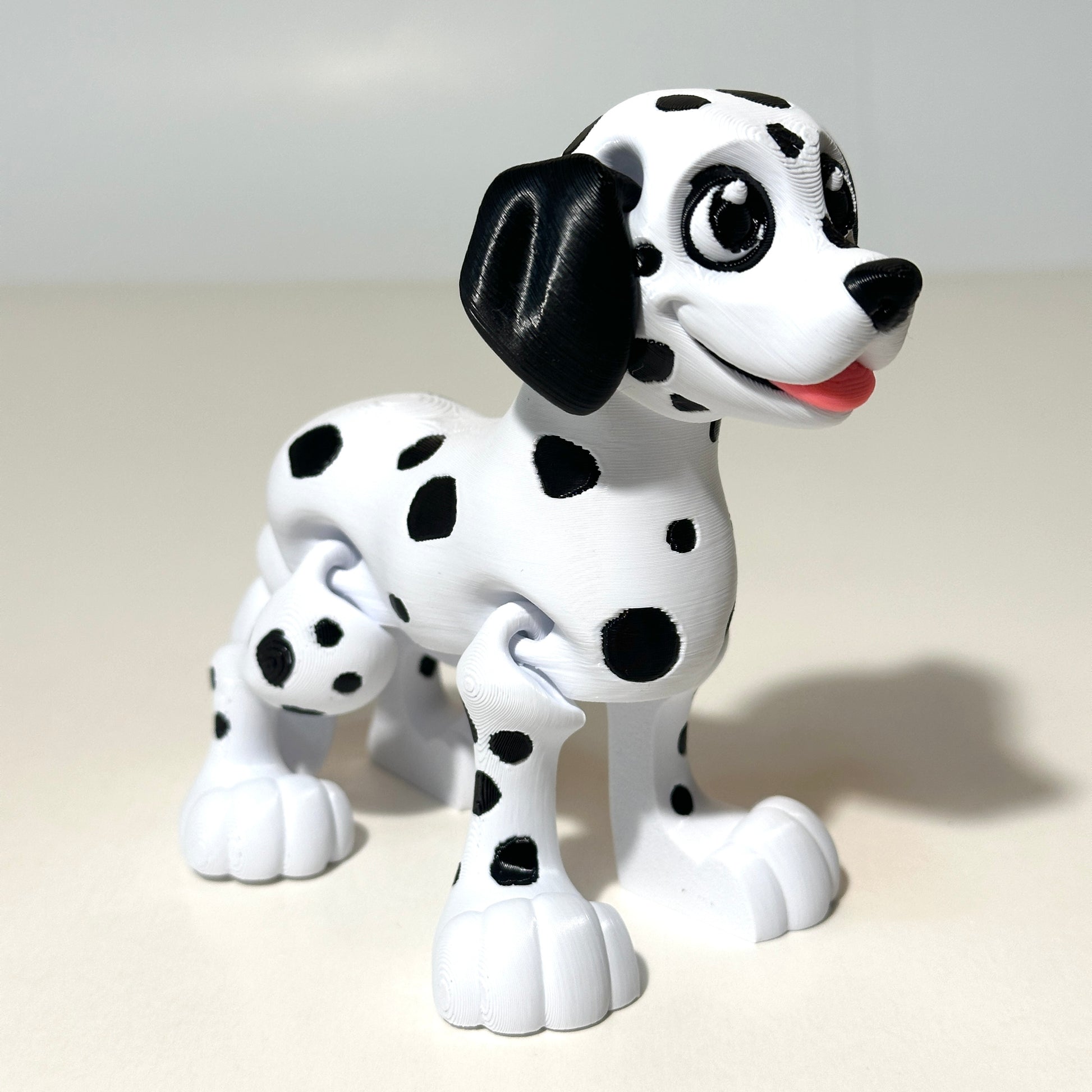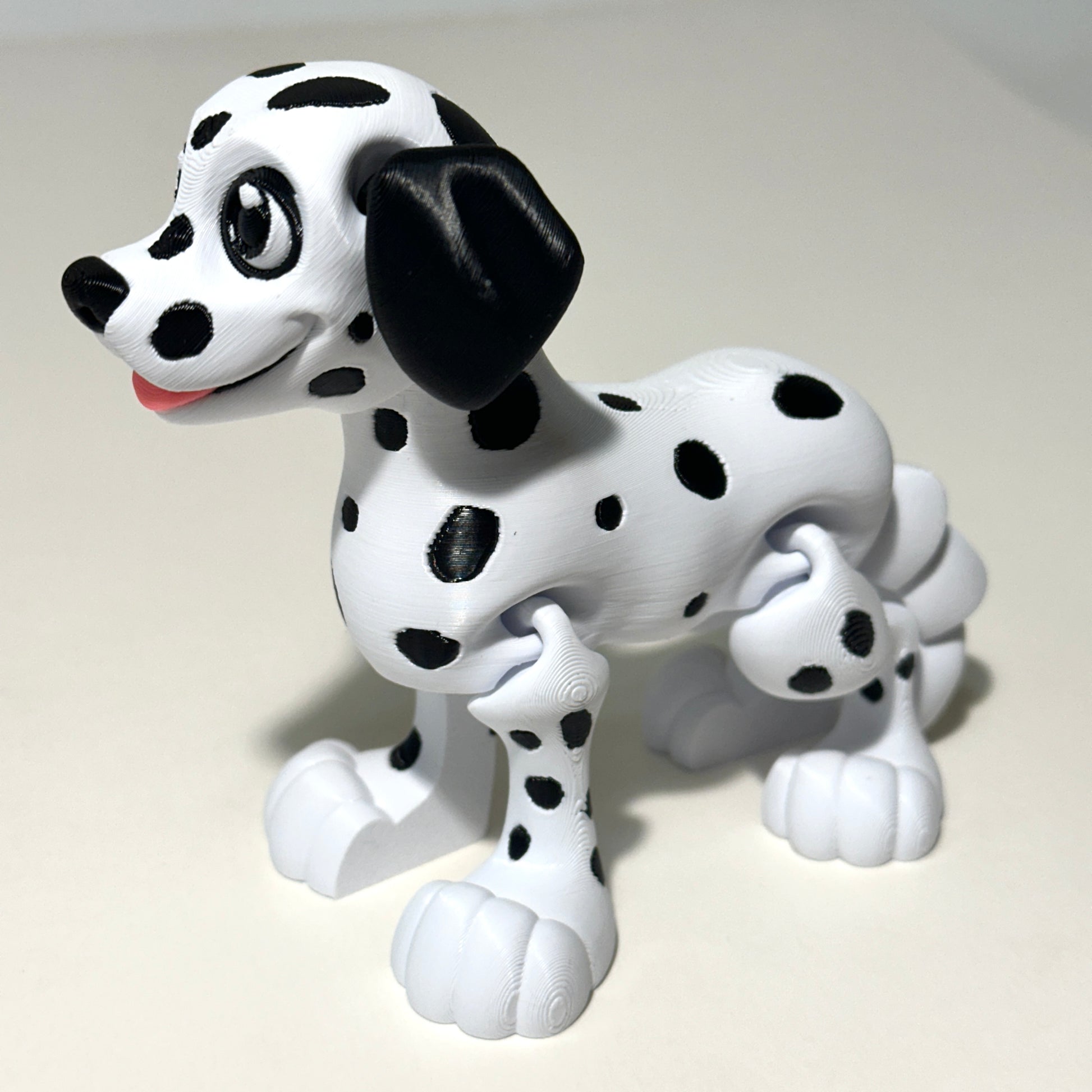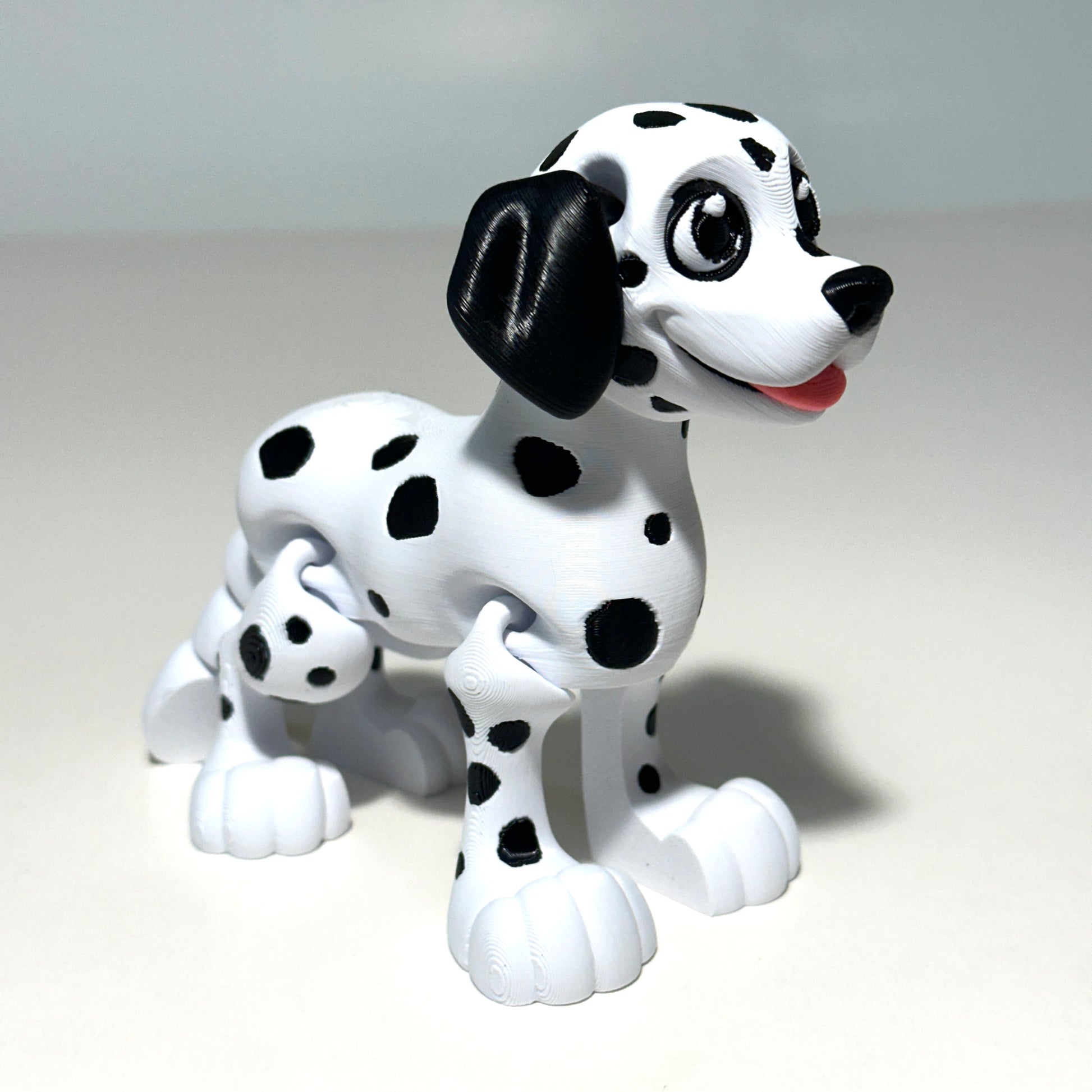 Meet your new spotted sidekick! This adorable 3D Printed Flexi Dalmatian is fully articulating, allowing it to strike playful and poseable positions. Standing approximately 4.25 inches tall, this charming pup brings a dash of fun and personality to any shelf, desk, or collection.