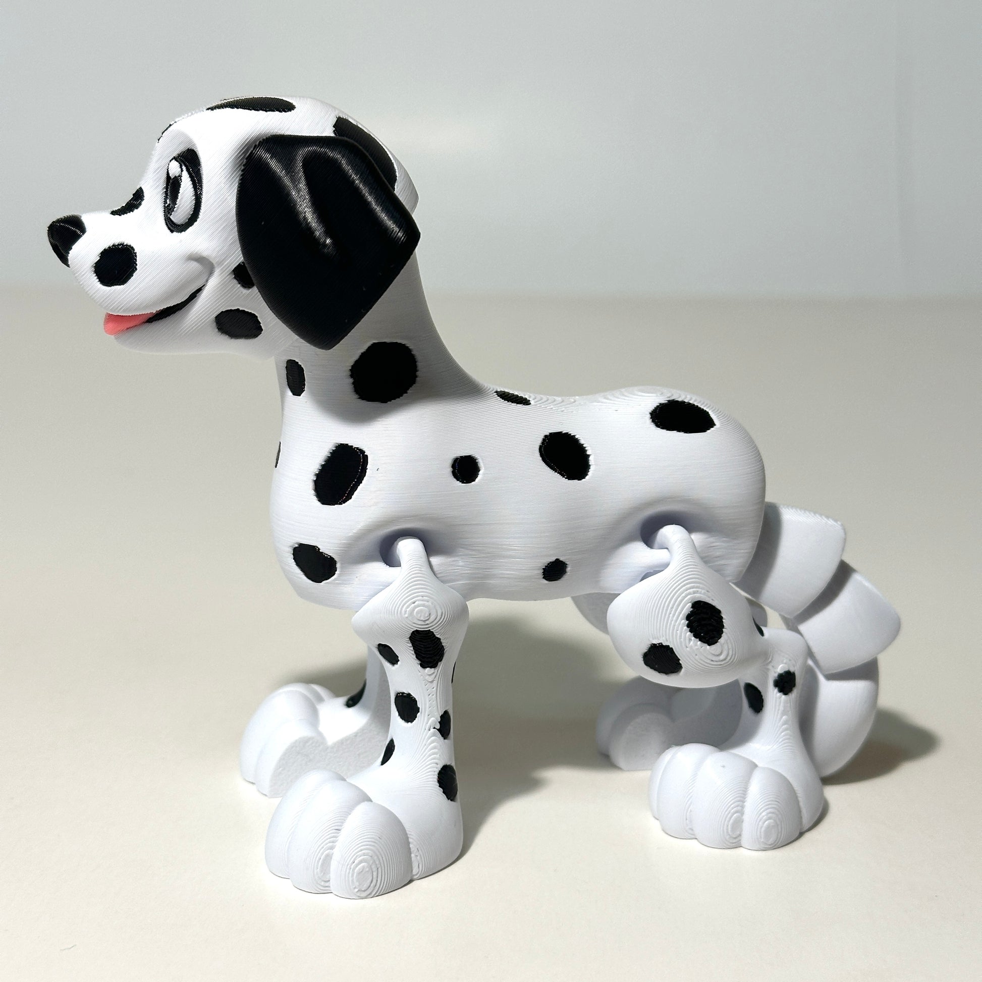 Crafted in a 3 color print, each Dalmatian has a unique look, making every piece one-of-a-kind. Printed using high-quality PLA filament, this model is both lightweight and durable—perfect for display or gentle fidgeting. PLA is an eco-friendly, plant-based material known for its vibrant color output and smooth finish, making it an excellent choice for collectible pieces like this.