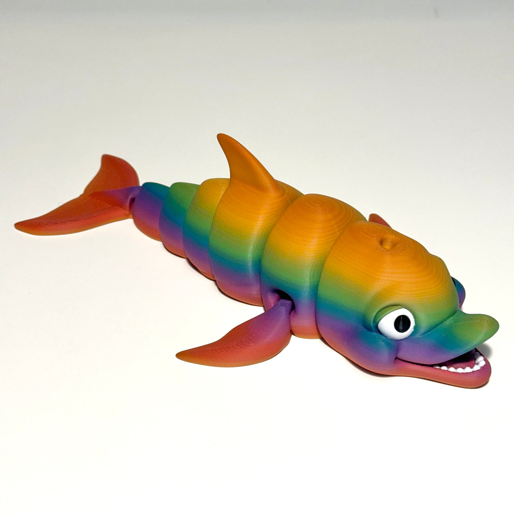 - Three-Color Print: Each Flexi Dolphin is printed using a tri-color filament process, resulting in a vibrant and eye-catching appearance. Please note that due to the nature of 3D printing, especially with rainbow colors, each piece is unique, and color variations are to be expected.