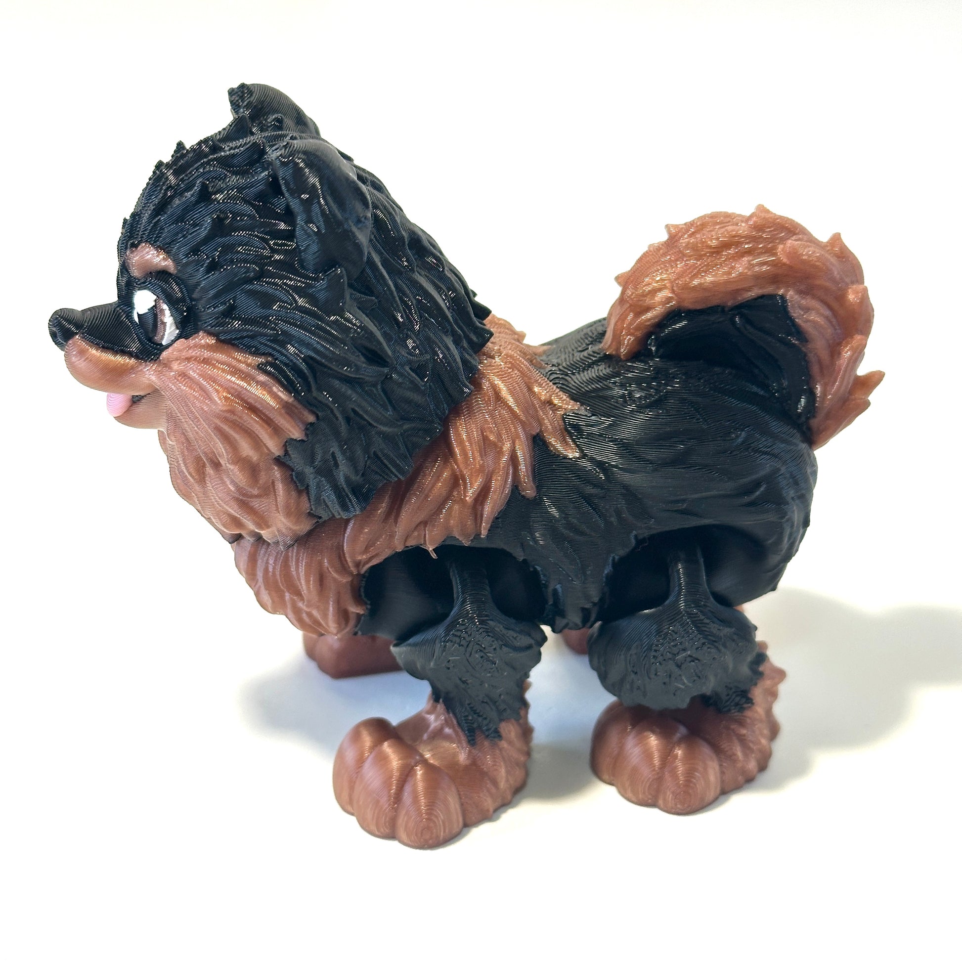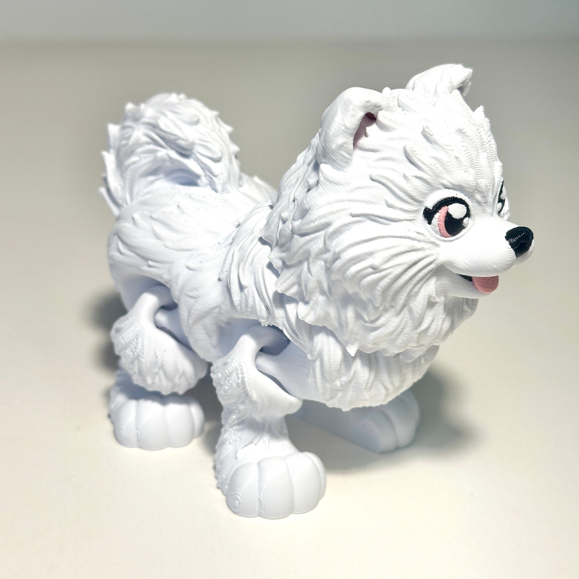 Each Pomeranian is 3D printed in high-quality PLA, a plant-based and environmentally friendly material known for its durability and vibrant color options. It’s lightweight yet sturdy, making it ideal for detailed models like this one. The articulating design means you can gently pose the legs and tail, adding a touch of motion and fun to your new furry friend.