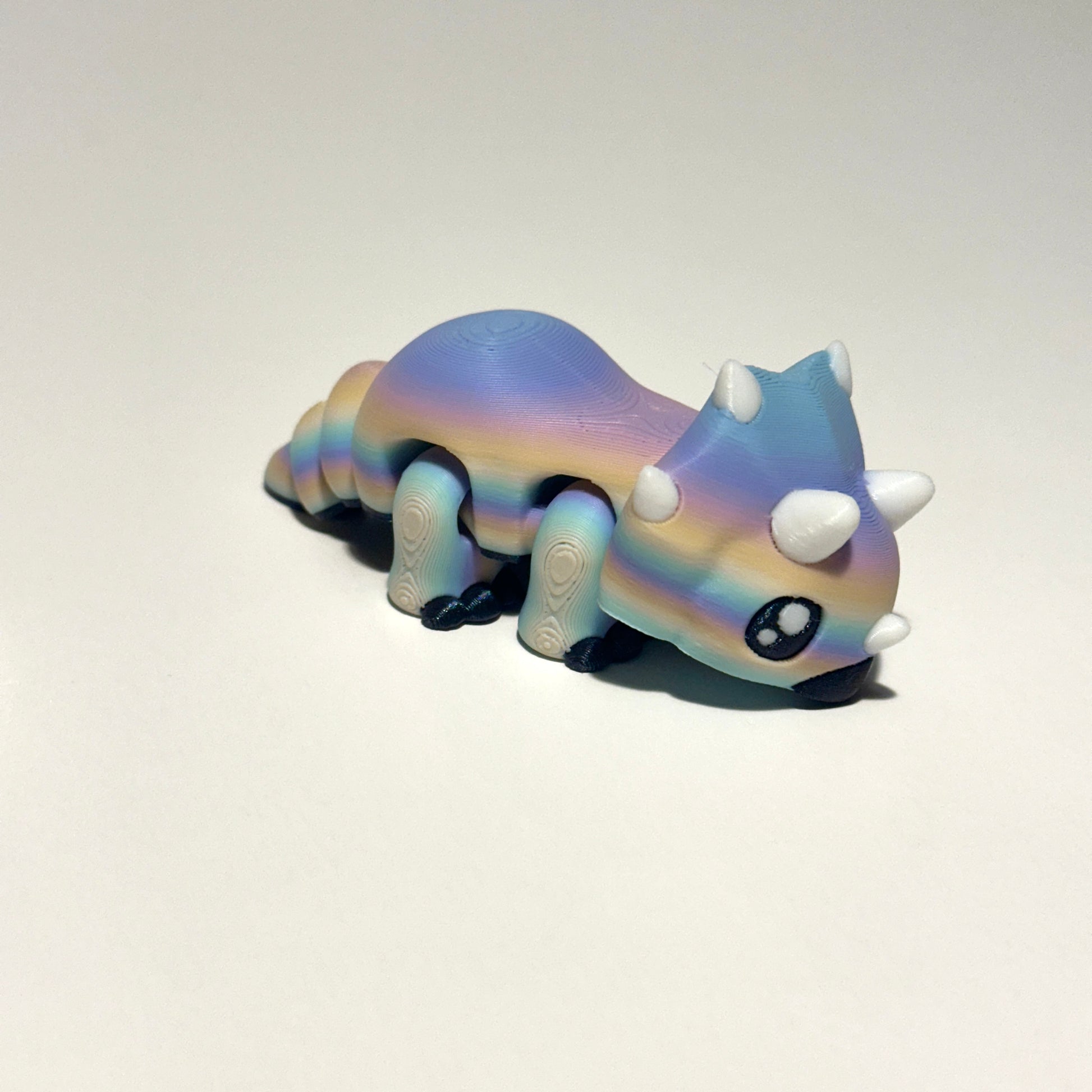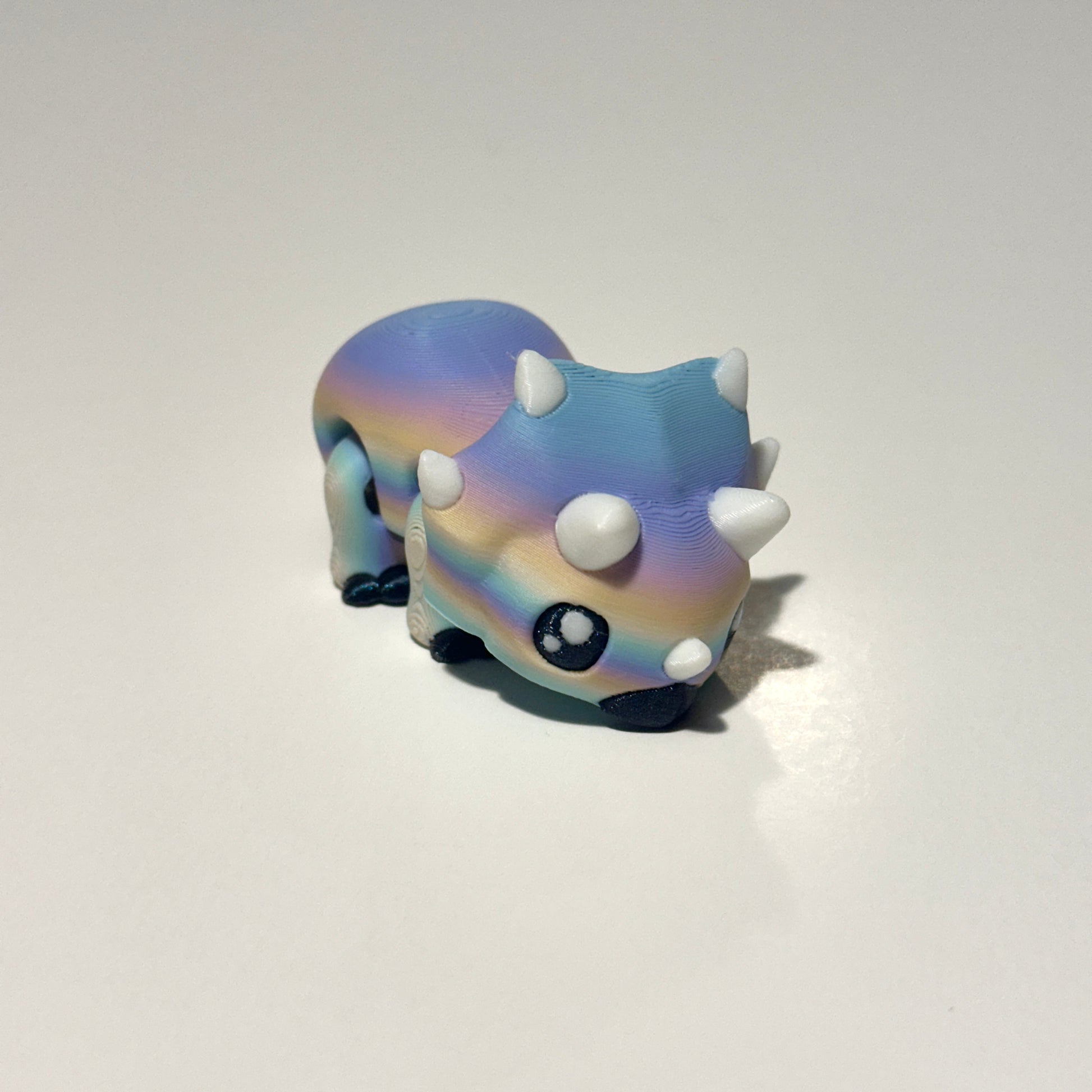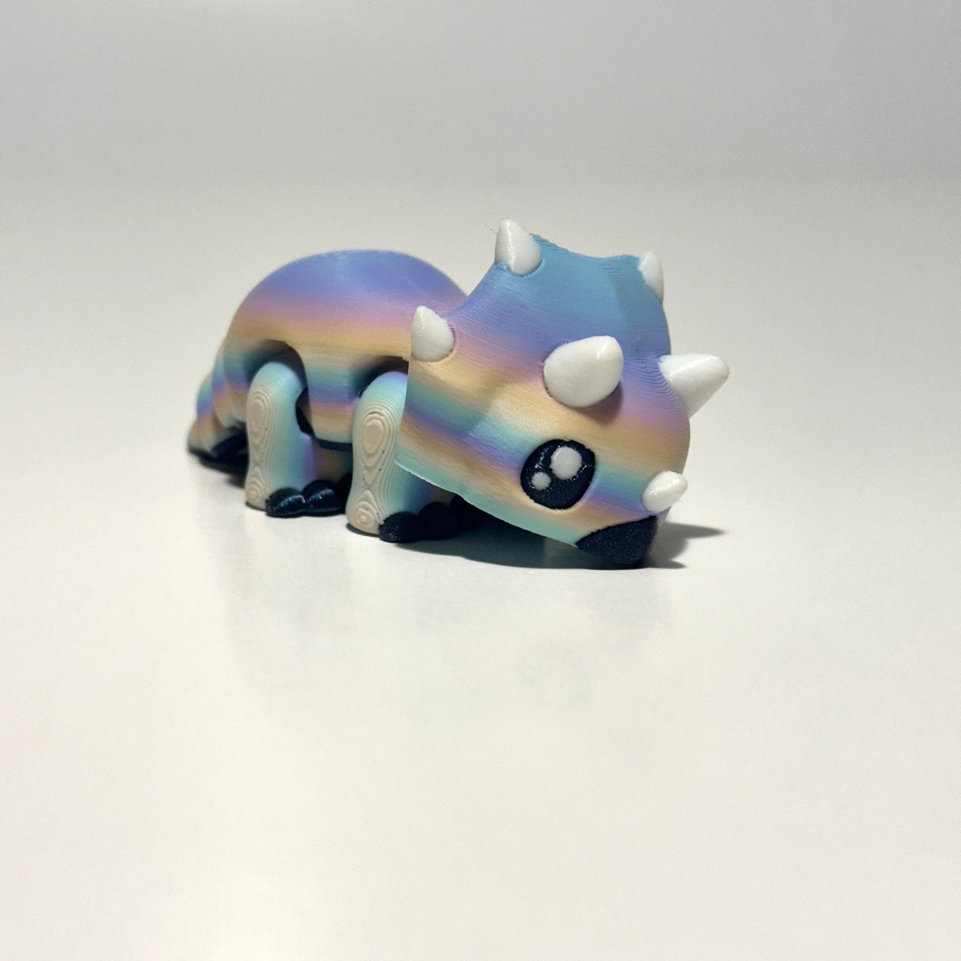 Bring the prehistoric era to life with this charming 3D Printed Flexi Triceratops! Measuring approximately 4 inches long, this fully articulating dinosaur features intricate details and vibrant, multi-colored filaments for a unique look. Its flexible design allows for dynamic posing, making it an engaging display piece for dinosaur enthusiasts of all ages.