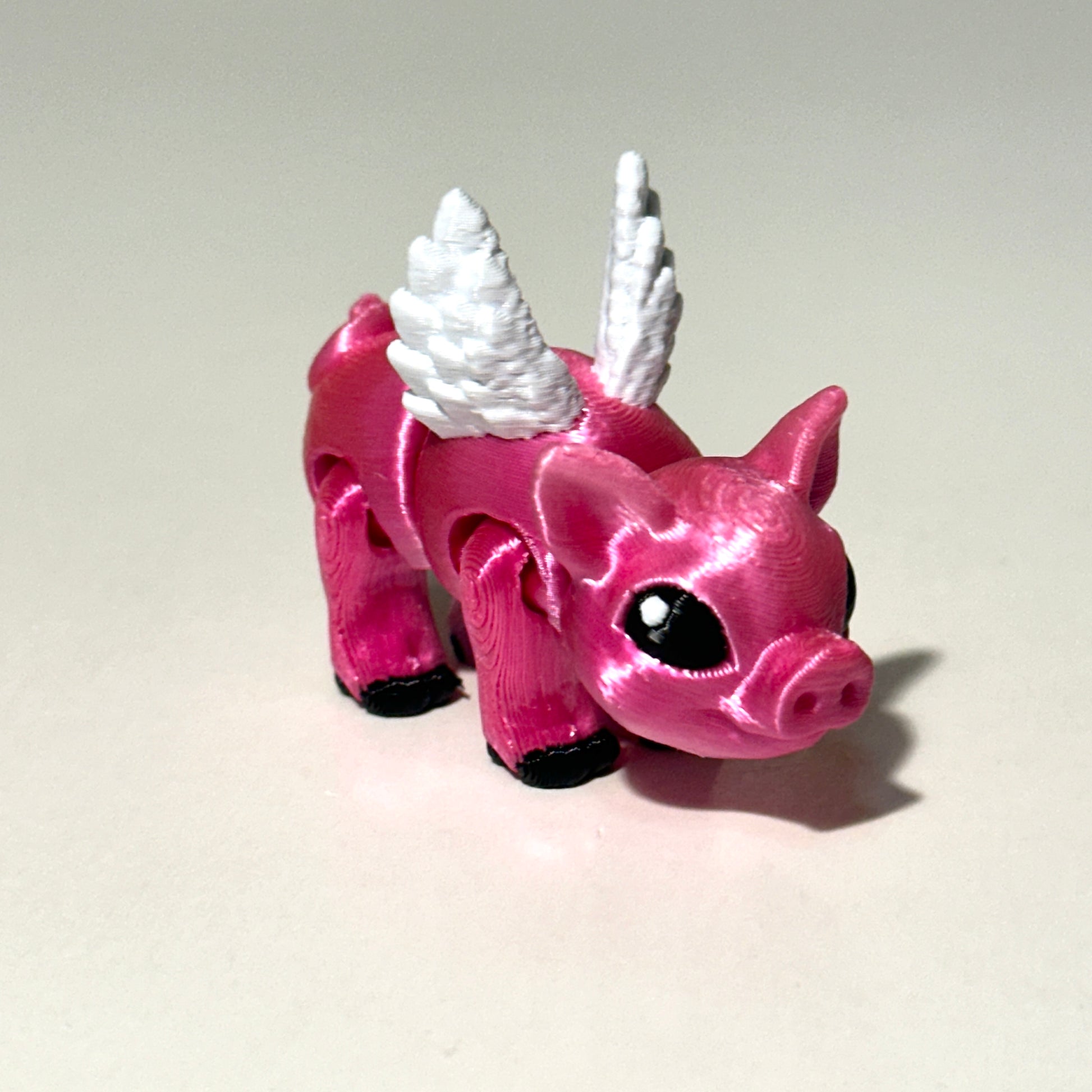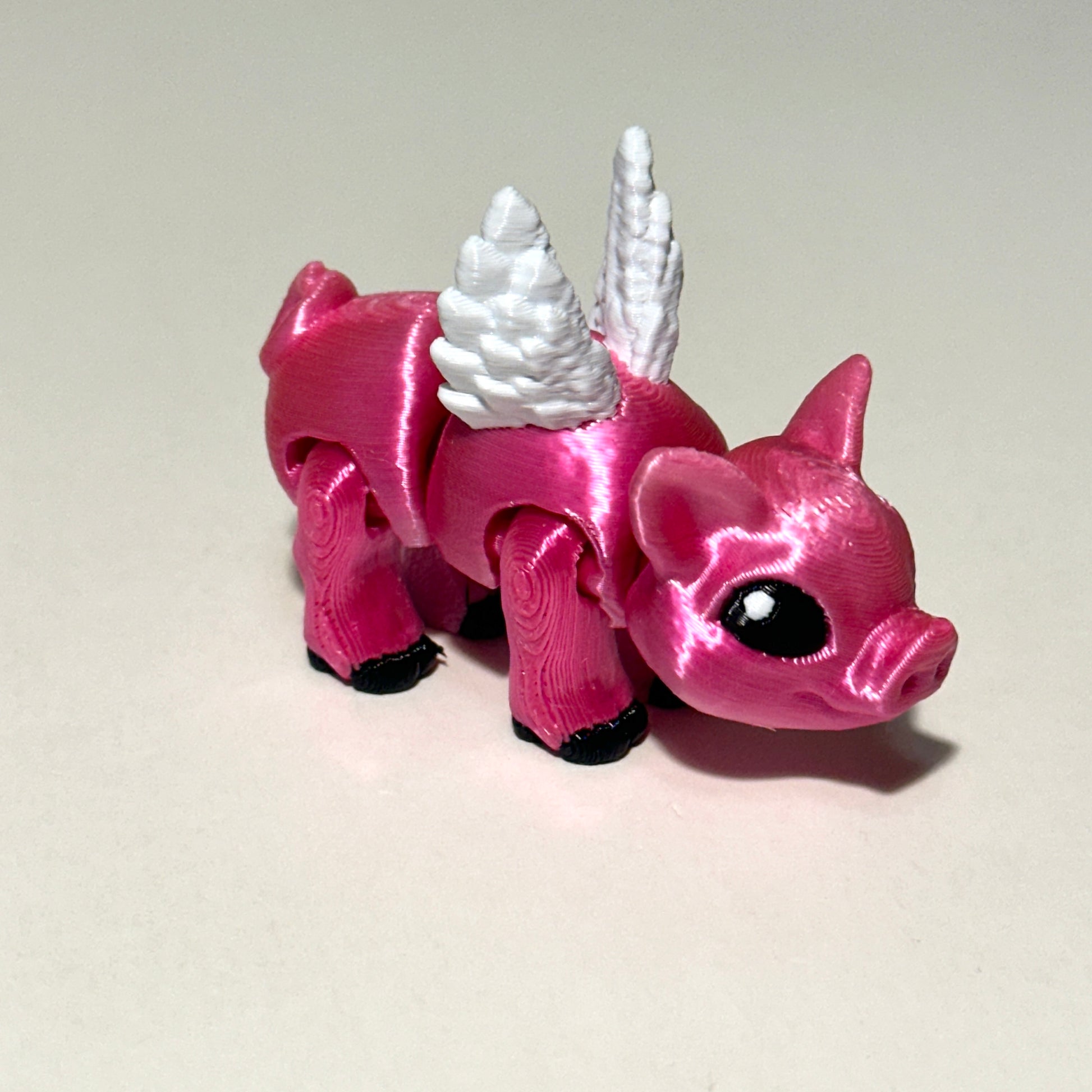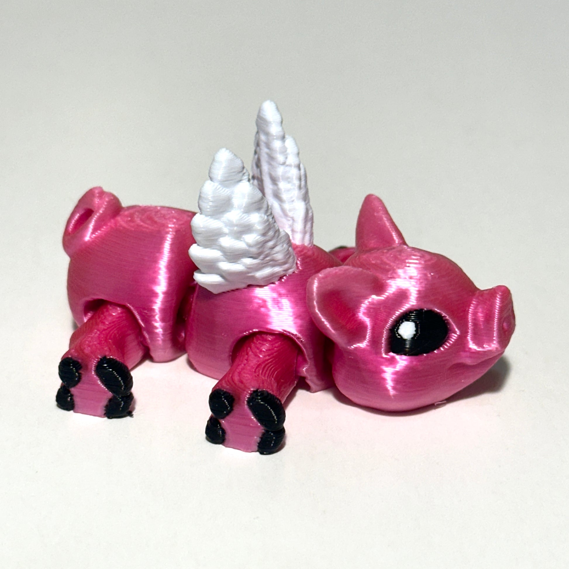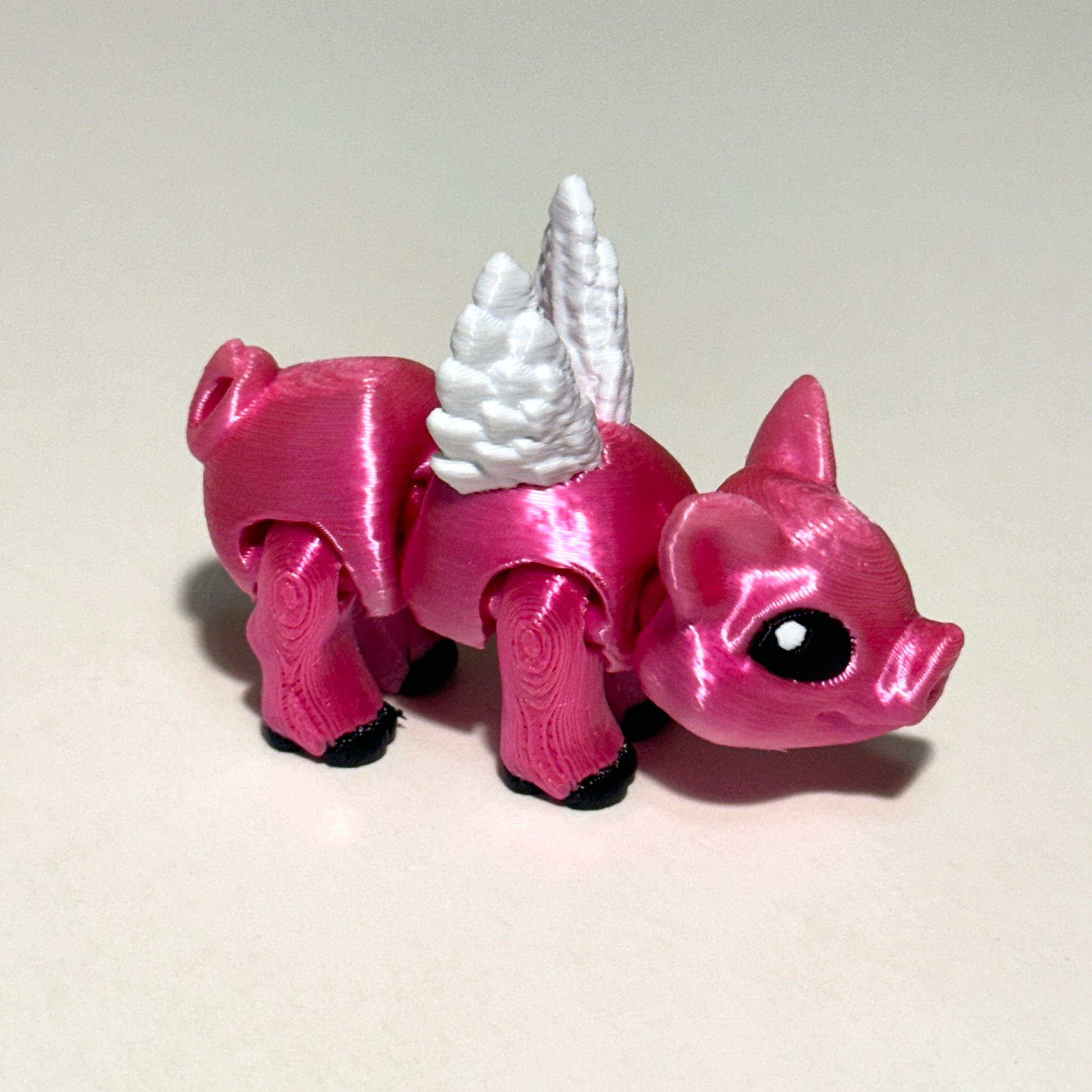 Who says pigs can't fly? Bring a bit of whimsy to your day with this adorable 3D Printed Flying Pig! Measuring approximately 2.5 inches long, this charming little piglet comes complete with movable wings and fully articulating limbs, making it a fun and poseable companion for your desk, shelf, or collection.