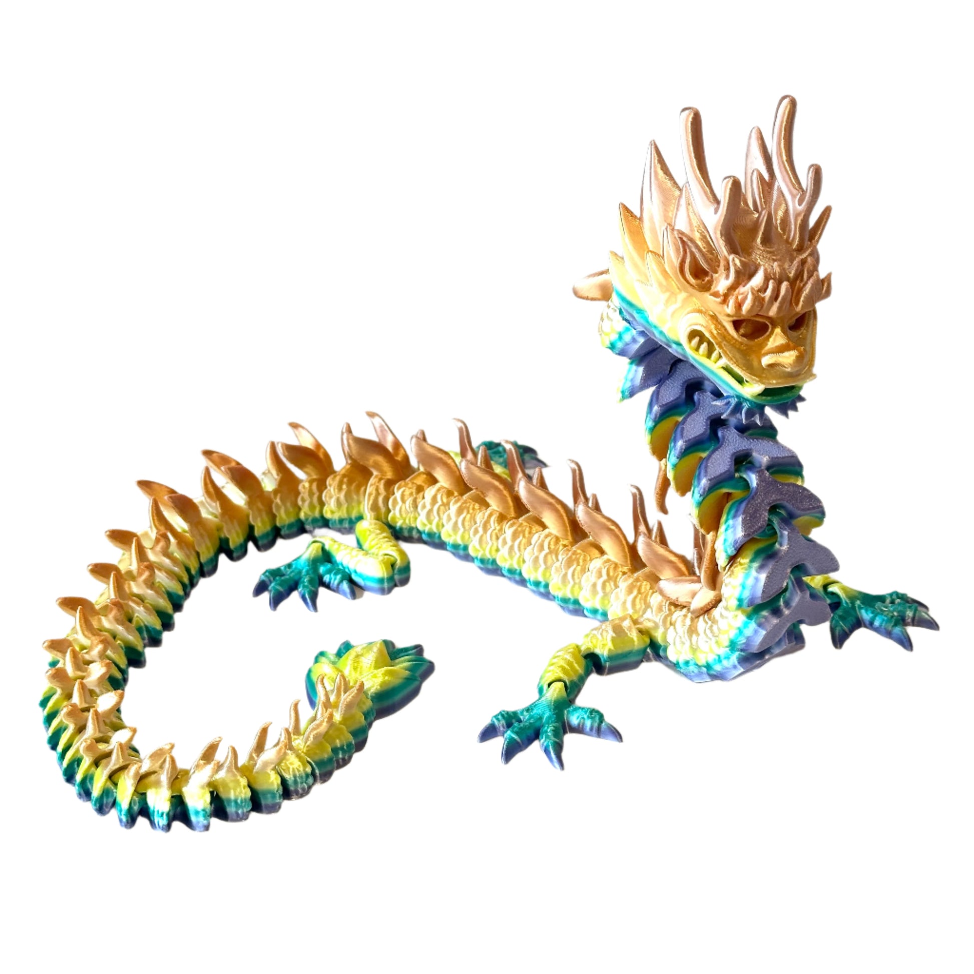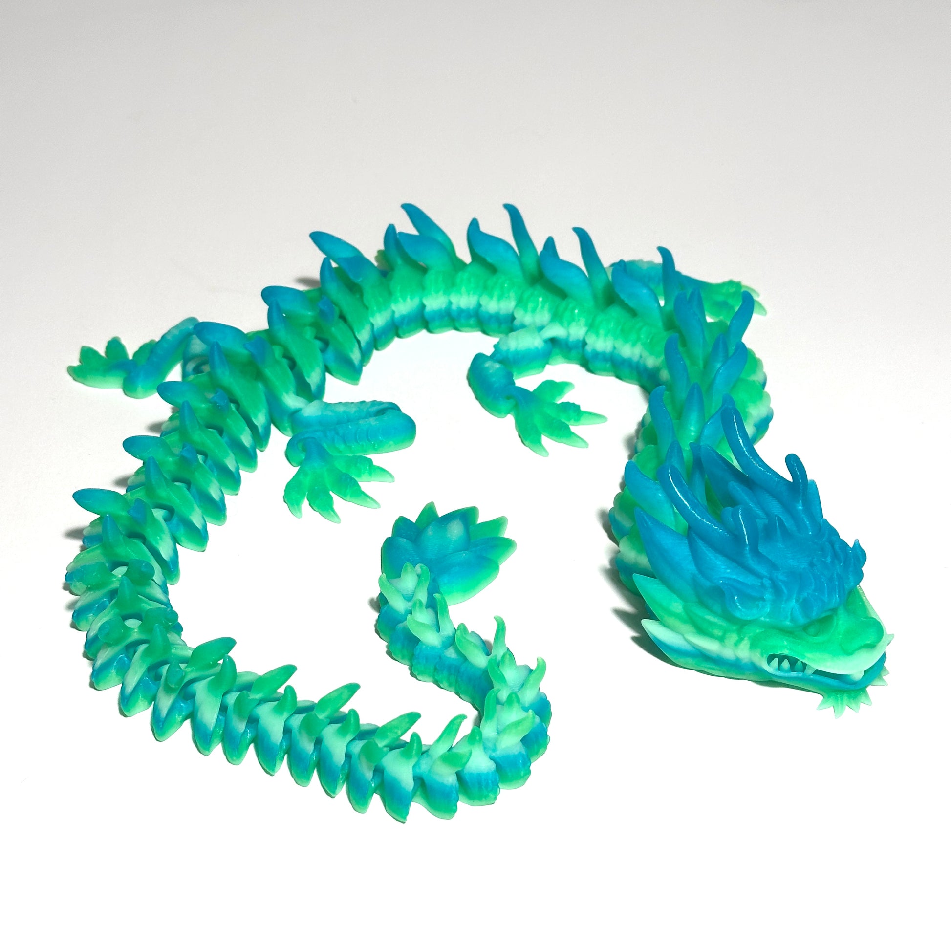 This dragon is 3D printed in high-quality PLA, an environmentally friendly and lightweight material known for its vibrant colors, durability, and smooth finish. Its articulated design allows for fluid movement while maintaining structural integrity, making it a fantastic display piece.