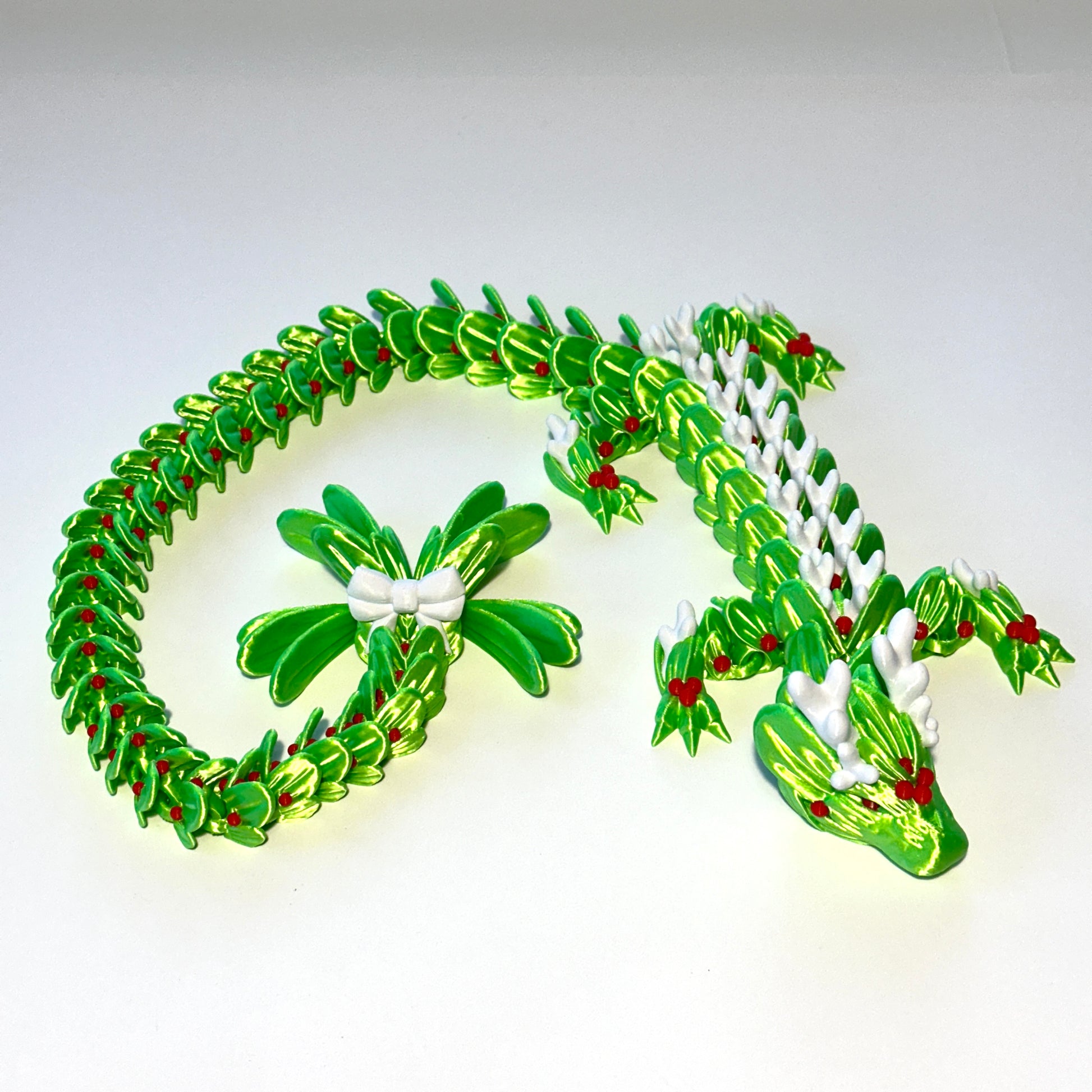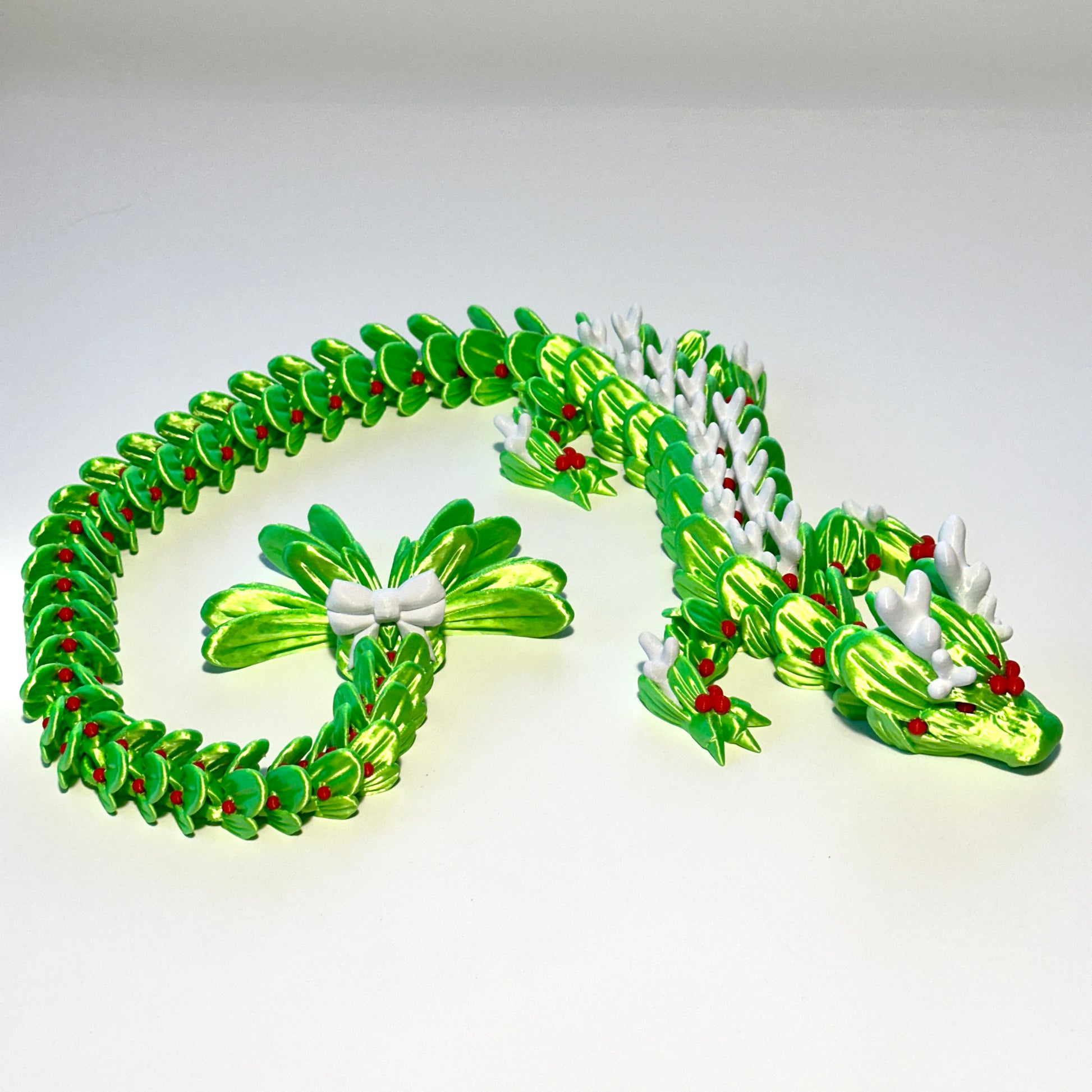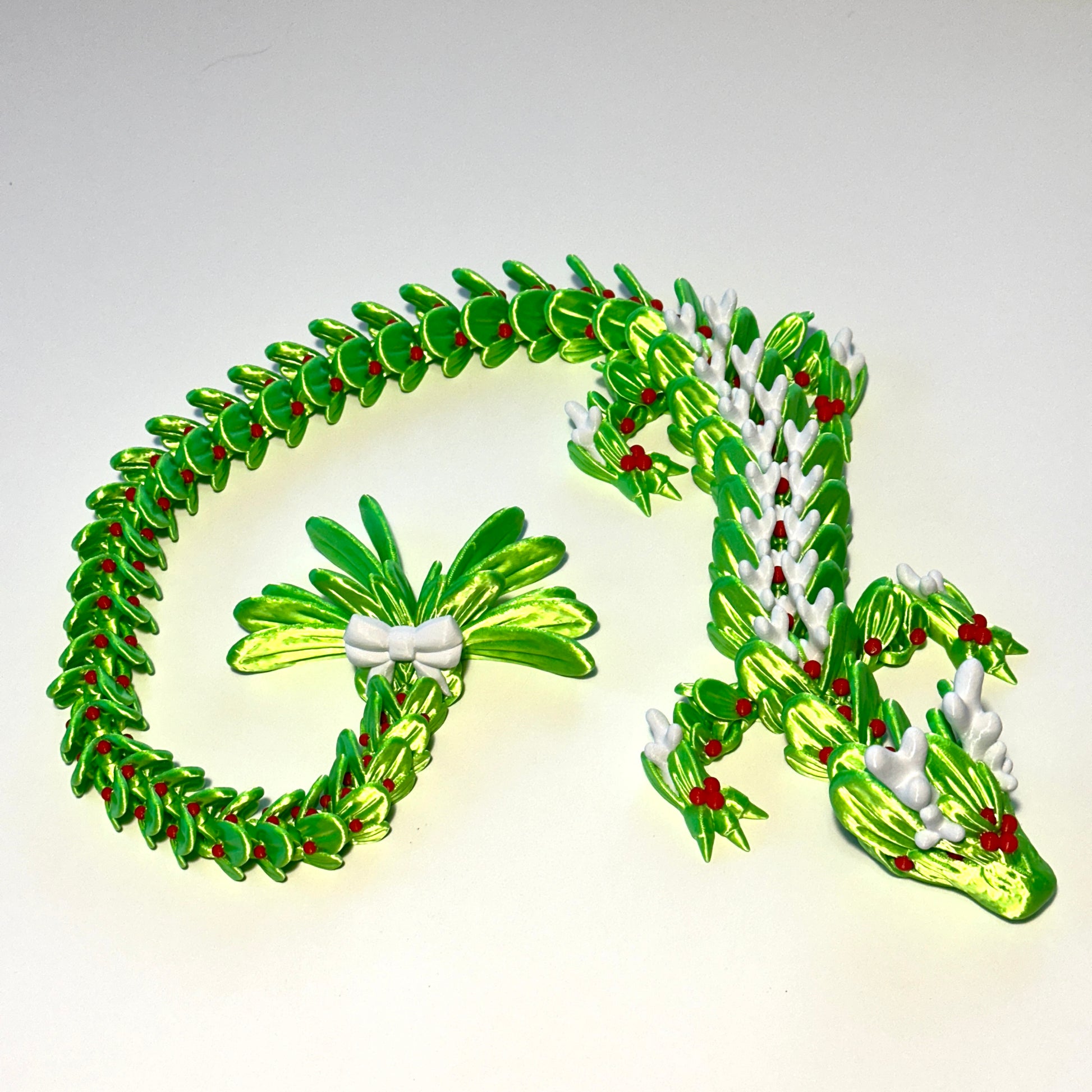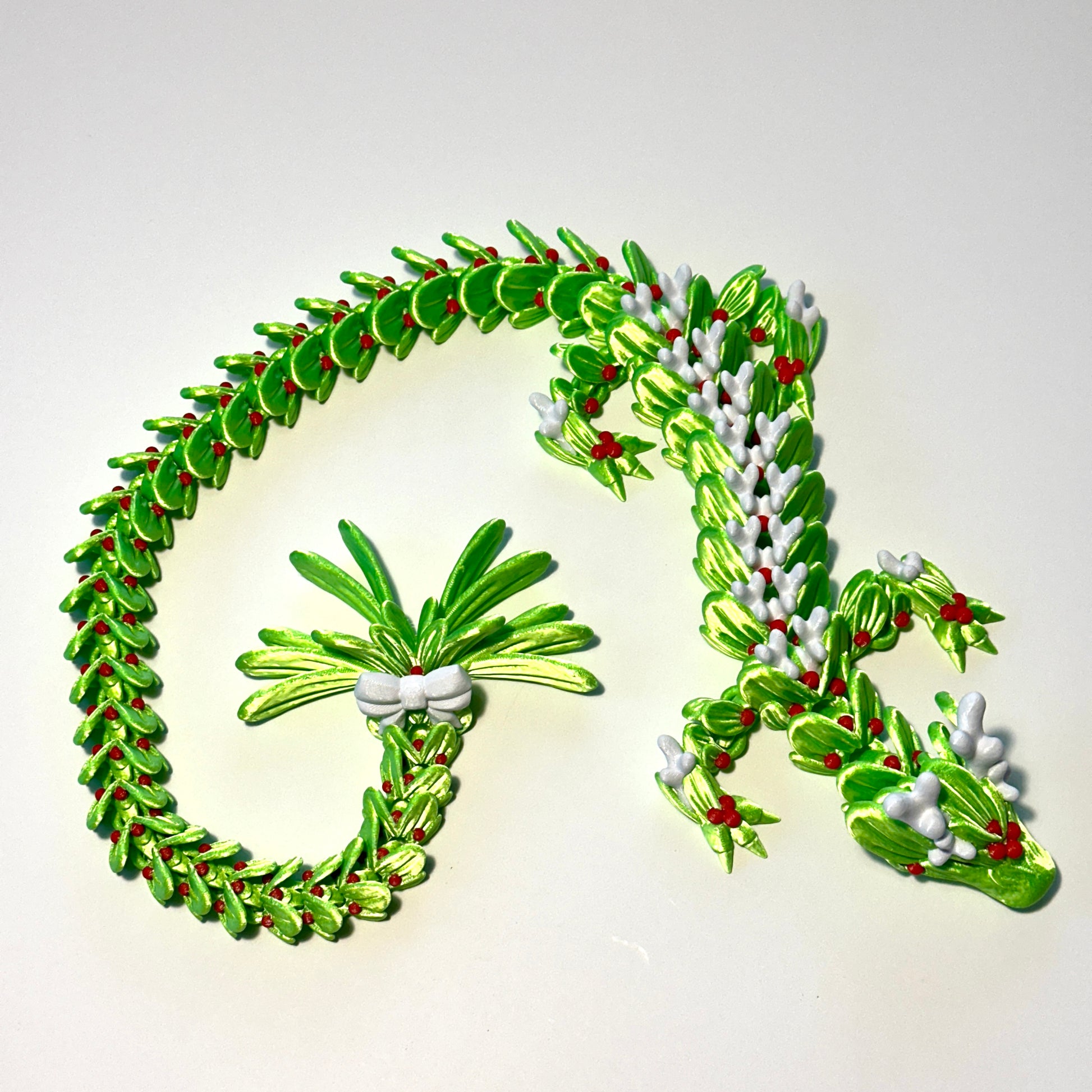 Enchant your holiday season with the Mistletoe Dragon, a 3D printed masterpiece that combines fantasy and festivity! This fully articulating dragon is meticulously crafted in vibrant, holiday-inspired colors, creating a striking display piece that captures the magic of winter. Measuring an impressive 29 inches long, this three-color dragon is designed with intricate details, from its textured scales to the festive mistletoe accents along its body.