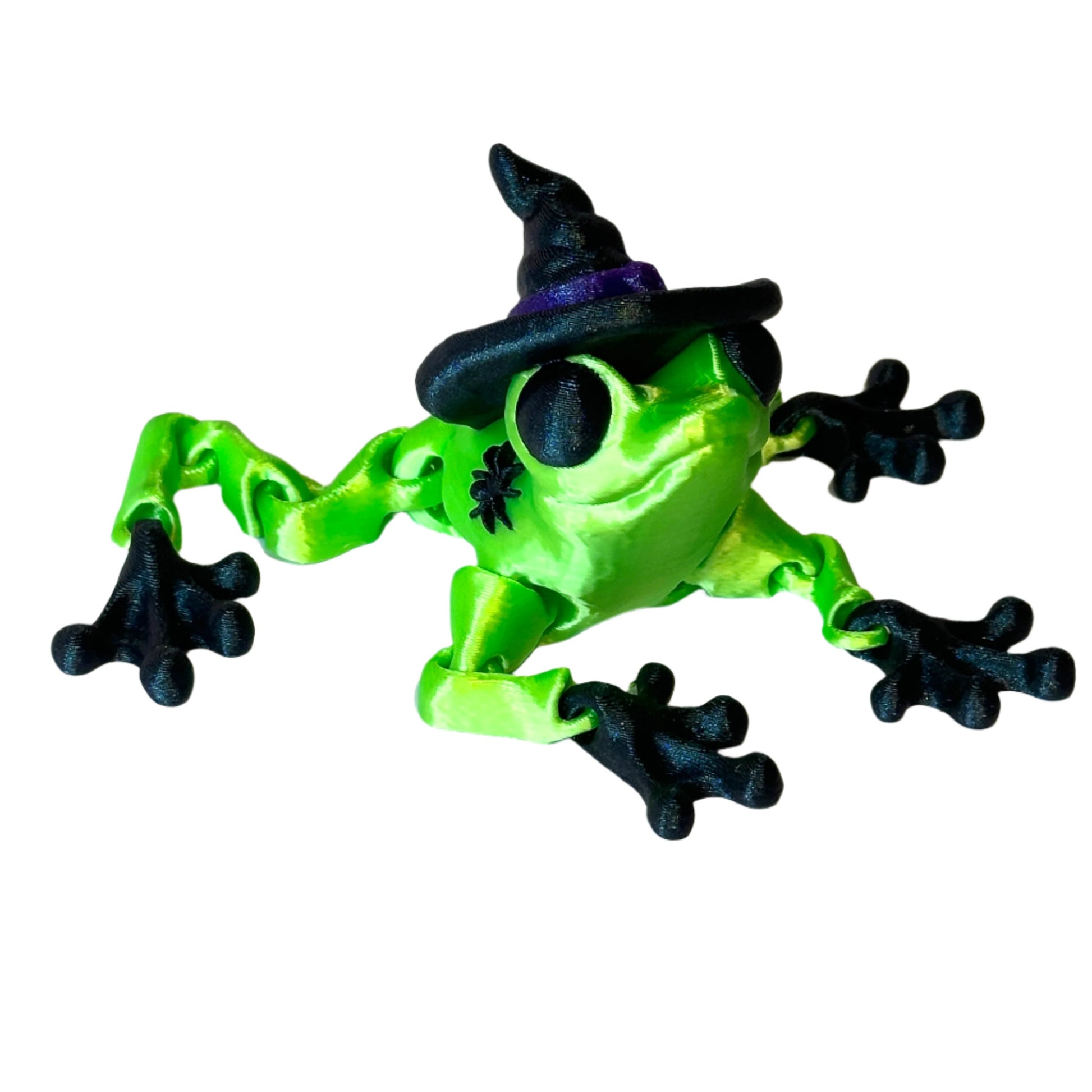 Bring a touch of magic to your collection with our 3D printed Witch Frog! This fully articulating figure, measuring approximately 5 inches long, features an adorable frog wearing a whimsical witch hat with a tiny spider crawling on its body, making it the perfect blend of charm and spookiness.